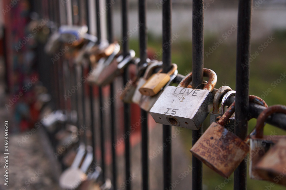 Samolepka Padlocks attached to a fence to symbolize the love of a couple