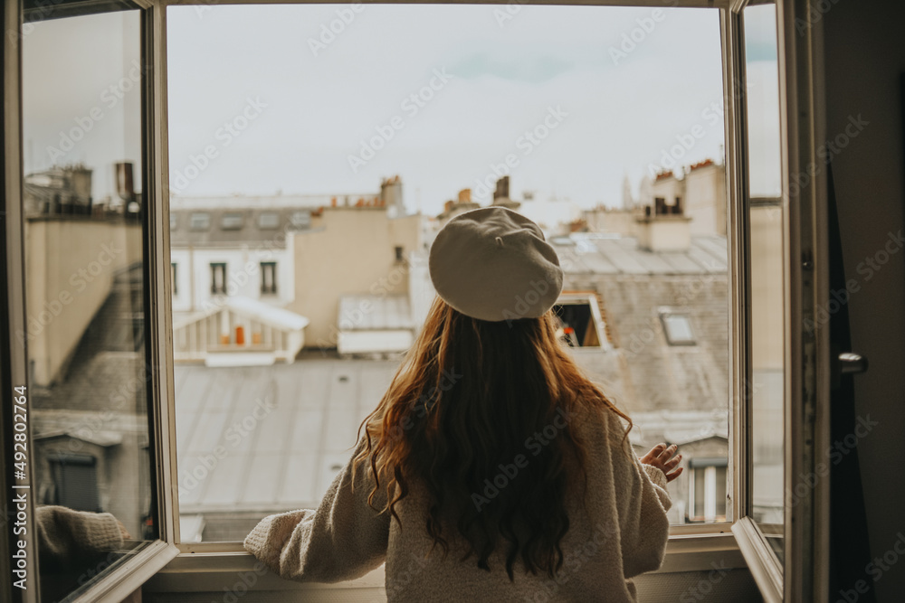 Samolepka A woman stands near the window against the backdrop of the roofs of Paris