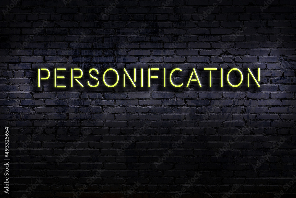Samolepka Night view of neon sign on brick wall with inscription personification