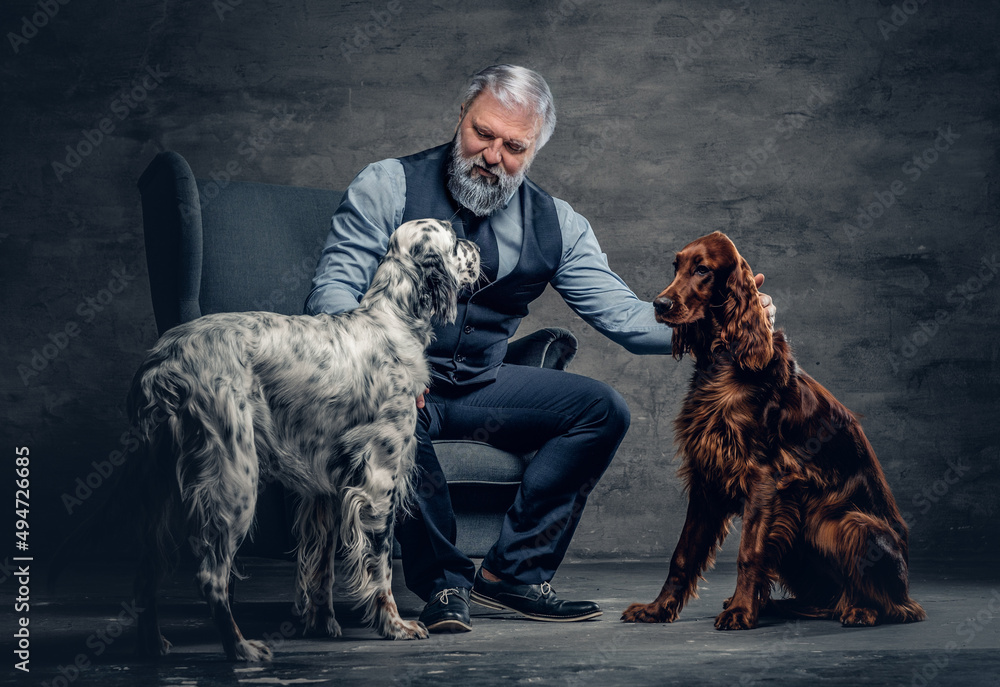 Samolepka Elderly man with his purebred dogs sitting on armchair