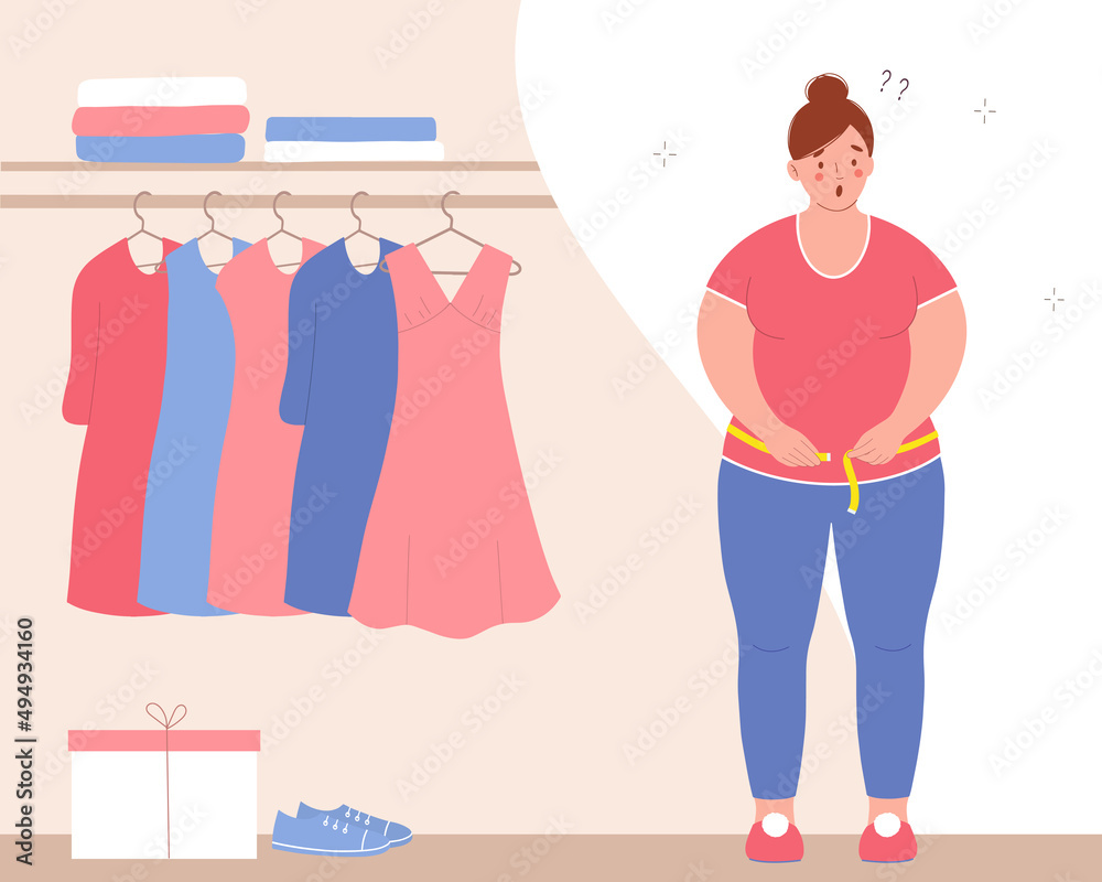 Samolepka Plump woman stands at the wardrobe, measuring her waist with tape measure