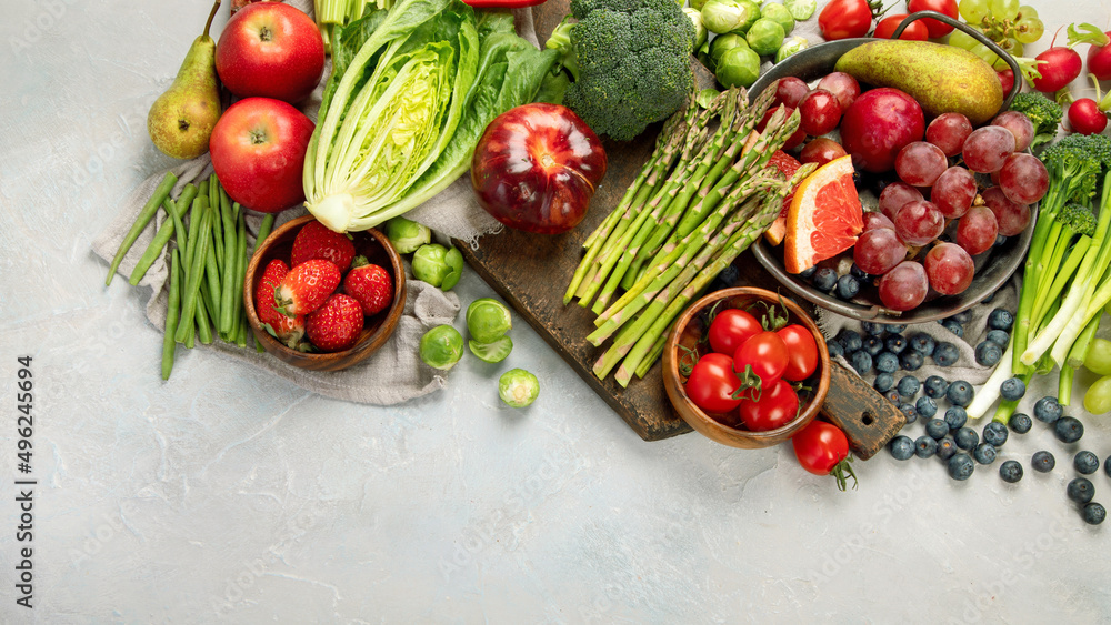 Samolepka Delicious raw fruits and vegetables on light background.
