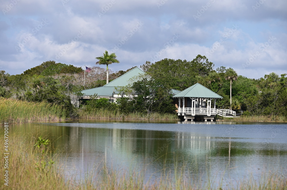 Samolepka Ernest F Coe Visitor Center in Everglades National Park, Florida from Main Park Road on sunny spring morning