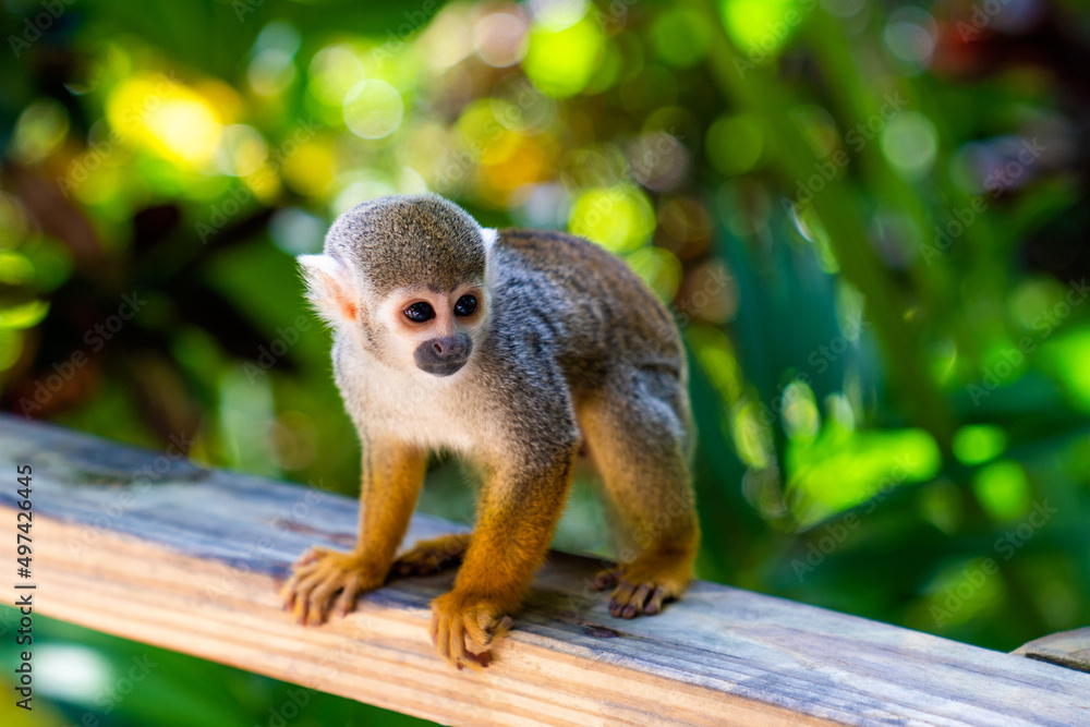 Samolepka Funny little saimiri monkey sits on a wooden fence in the jungle