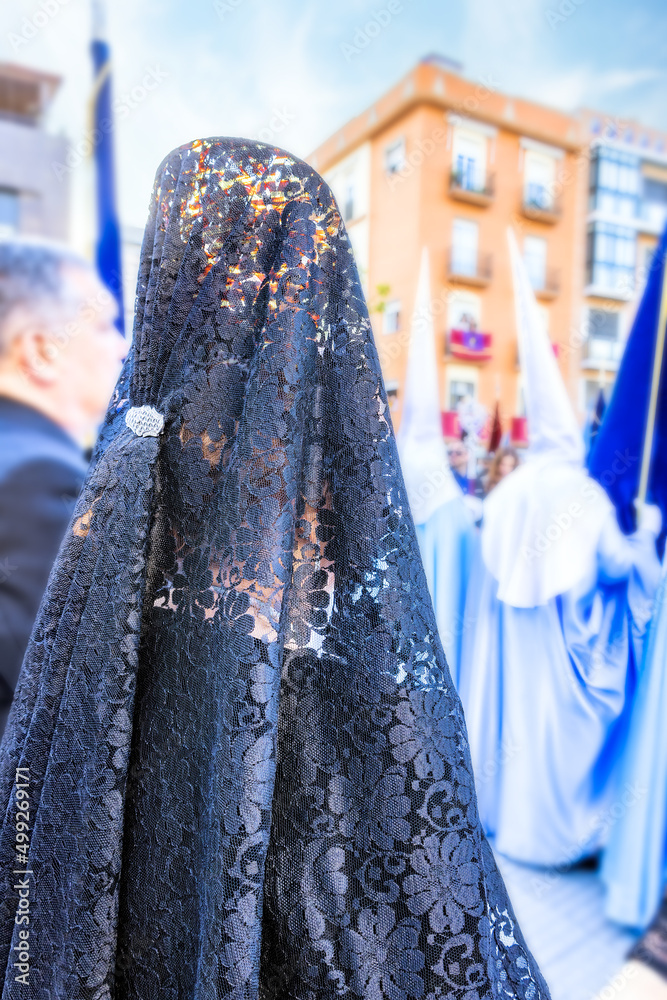 Samolepka Detail of the head of a woman with a black spanish mantilla and peineta (ornamen