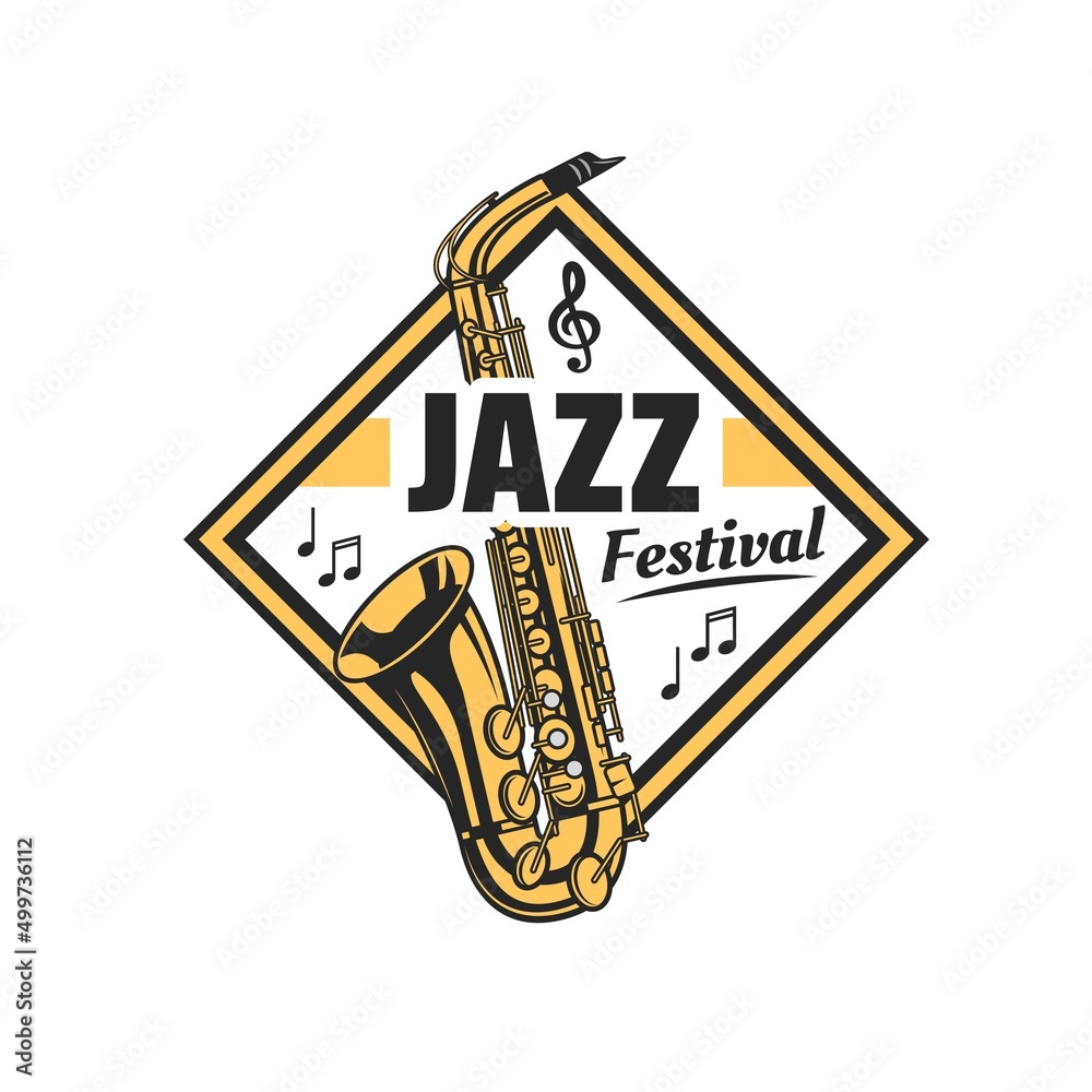 Samolepka Jazz festival icon with saxophone, music notes and treble clef