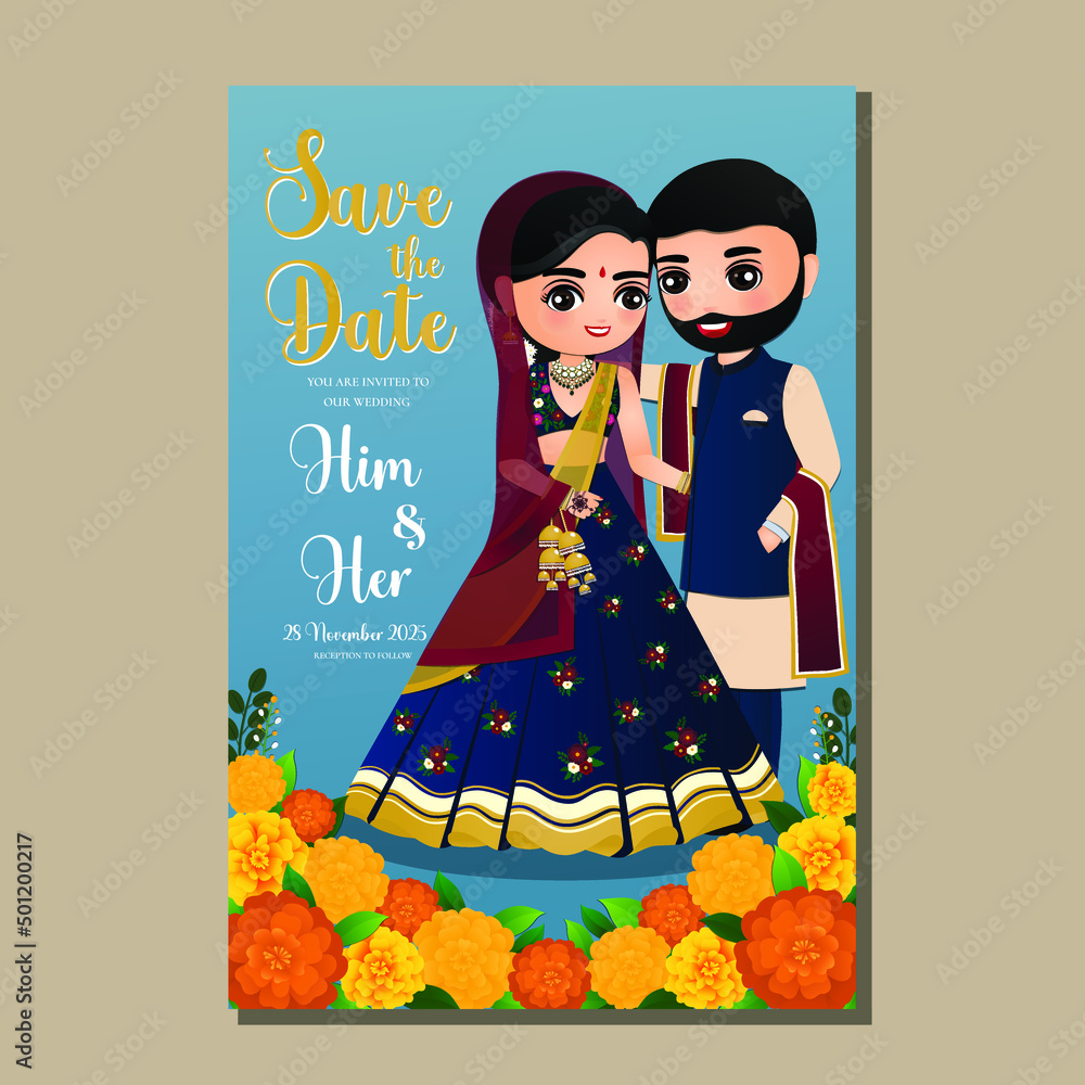 Samolepka Wedding invitation card the bride and groom cute couple in traditional indian dress cartoon character