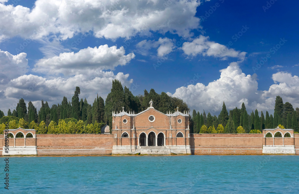 Samolepka Vista desde la laguna de Venecia del cementerio de San Michele, bajo un cielo azul con nubes