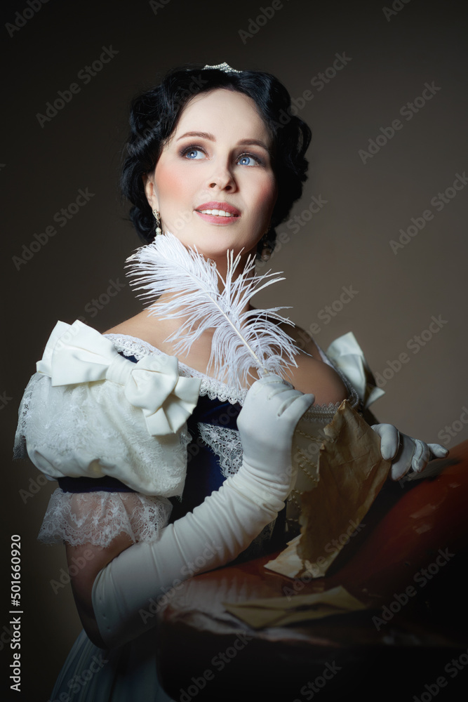Samolepka A lady with a smile in a historical costume with a feather in her hand and a letter