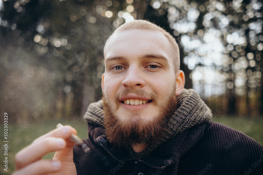 Samolepka Young man beard smokes cigarette or tobacco