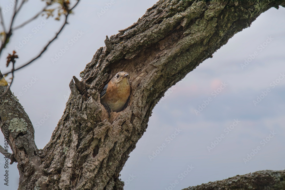 Samolepka Female bluebird peers out of her nest in a sassafras tree