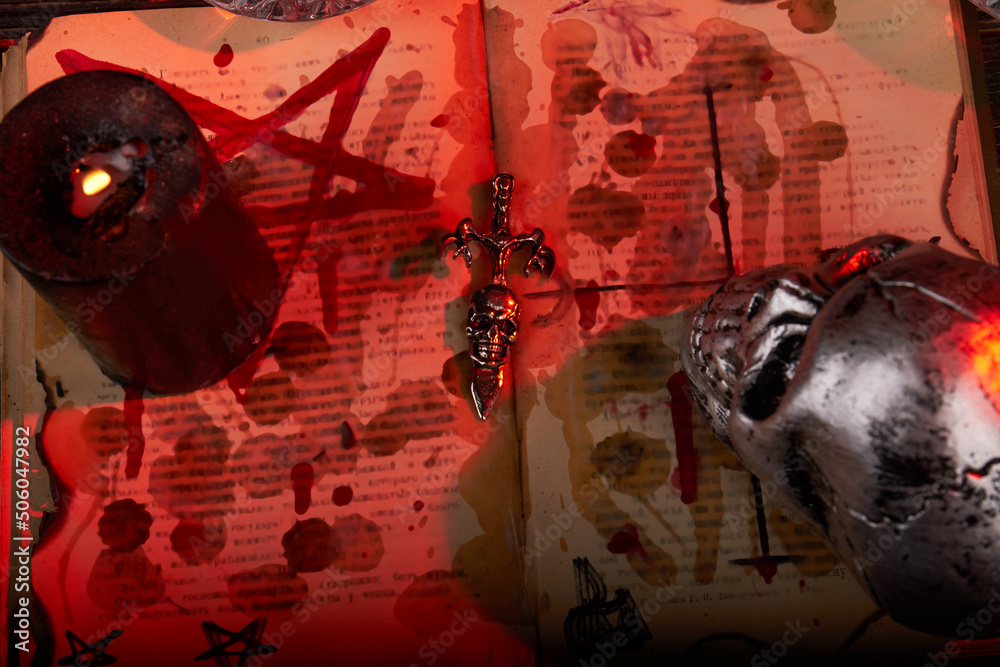 Samolepka Top view skull and satanic cross on the opened bloody satanic bible
