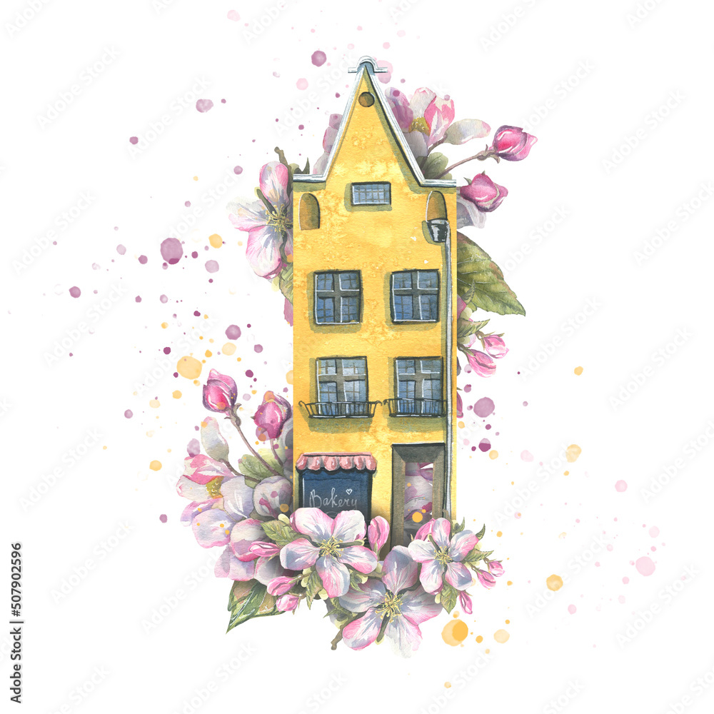 Samolepka An old European house in apple blossoms, with splashes of paint