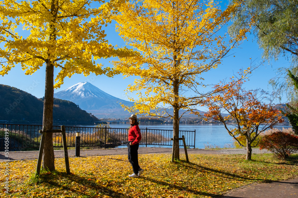 Samolepka Tourist and Beautiful yellow leaf of Gginkgo tree with Fuji mountain at Japan