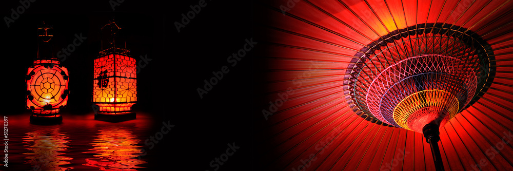 Samolepka Lanternes chinoises, ombrelle japonaise rouge sur fond panoramique noir, bannièr