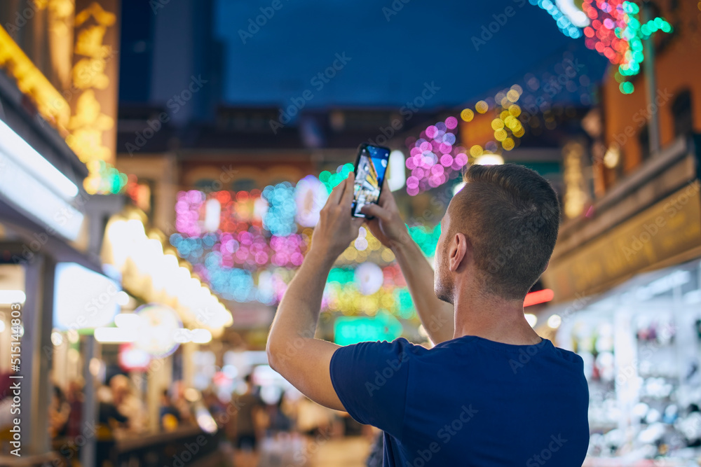 Samolepka Rear view of man while taking pictures with mobile phone on colorful street