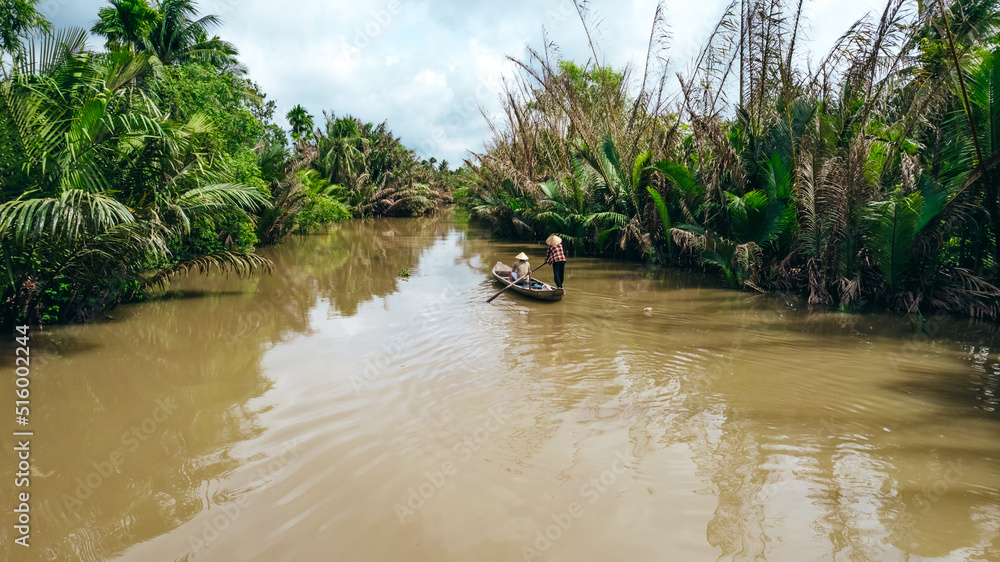 Samolepka tourist on sampan boat cruise in the Mekong river canals with woman paddling in