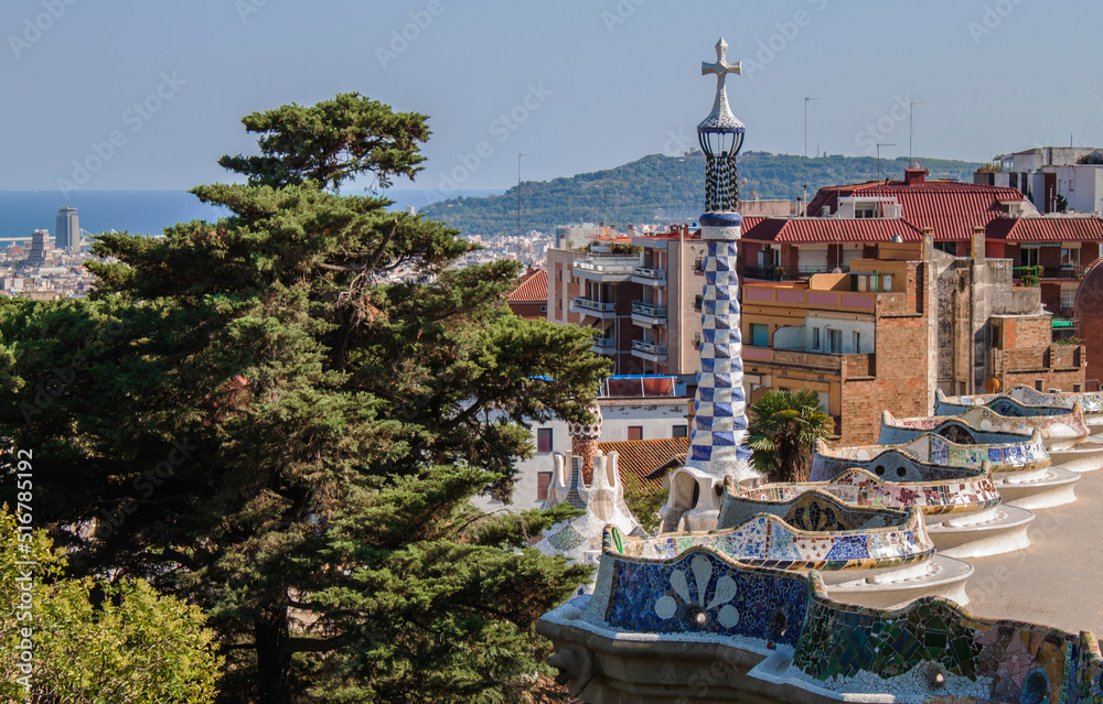 Samolepka Spire modernist tower of Park Güell, a public park system composed of gardens and architectonic elements located in La Salut neighborhood, on Carmel Hill in Barcelona, Catalonia, Spain, Europe