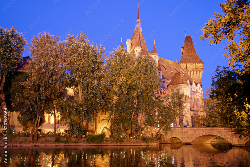 Samolepka Vajdahunyad castle at sunset, Varosliget city park, Budapest, Hungary