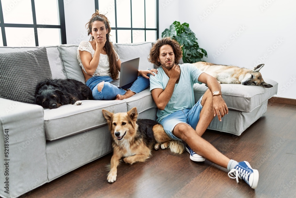 Samolepka Young hispanic couple with dogs relaxing at home touching painful neck, sore thr