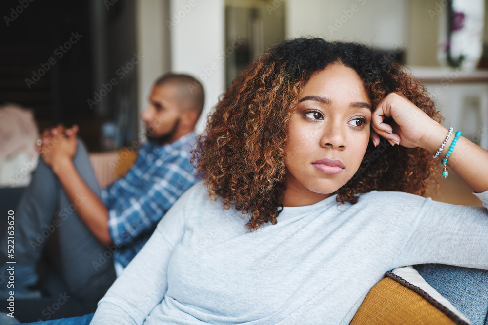 Samolepka Unhappy couple and sad woman upset after argument or conflict with her man on home sofa