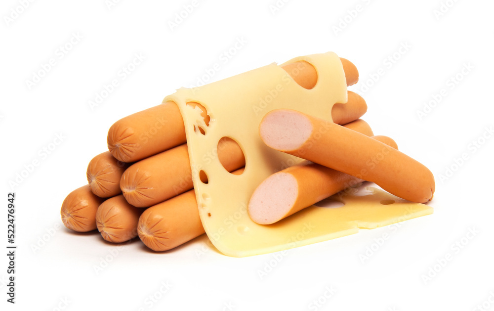 Samolepka Fresh boiled chicken sausages with Maasdam cheese, isolated on white background