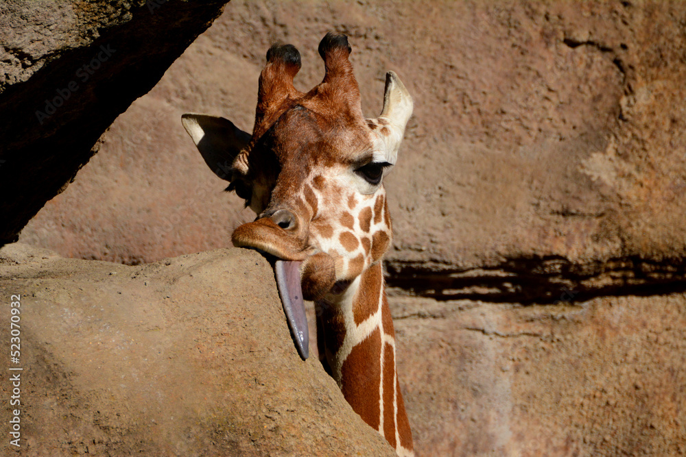Samolepka Silly giraffe licking a rock with blue tongue