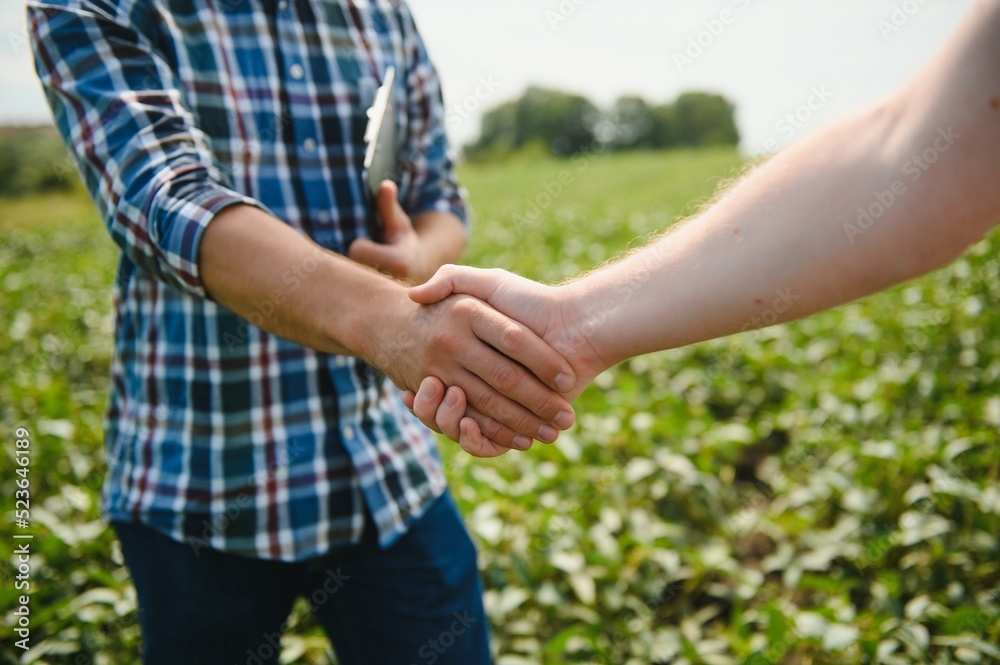 Samolepka Two farmers shaking hands in soybean field in early summer
