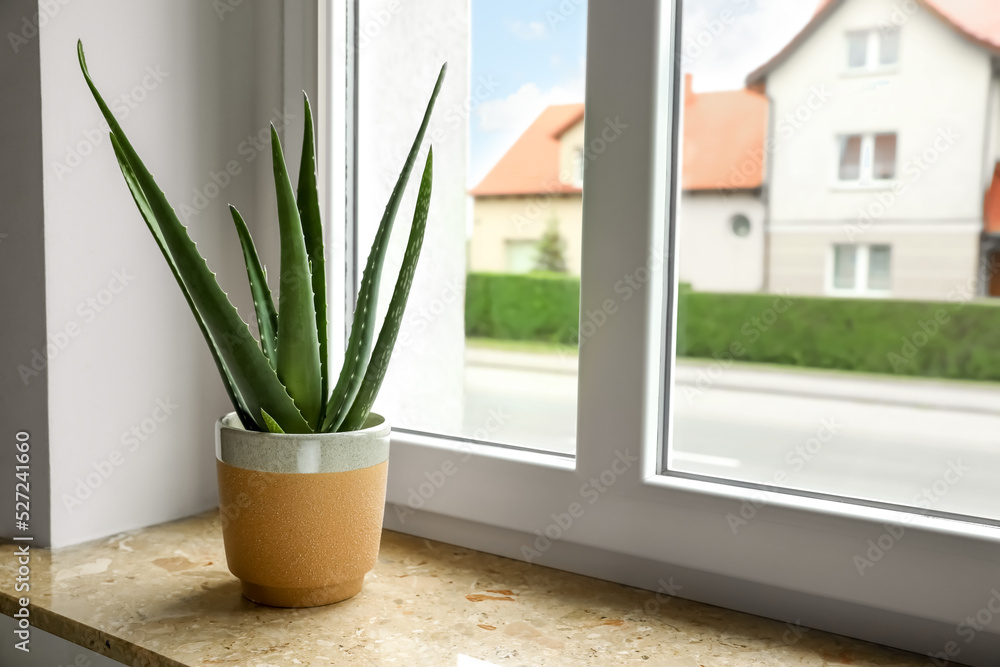 Samolepka Green aloe vera in pot on marble windowsill indoors, space for text
