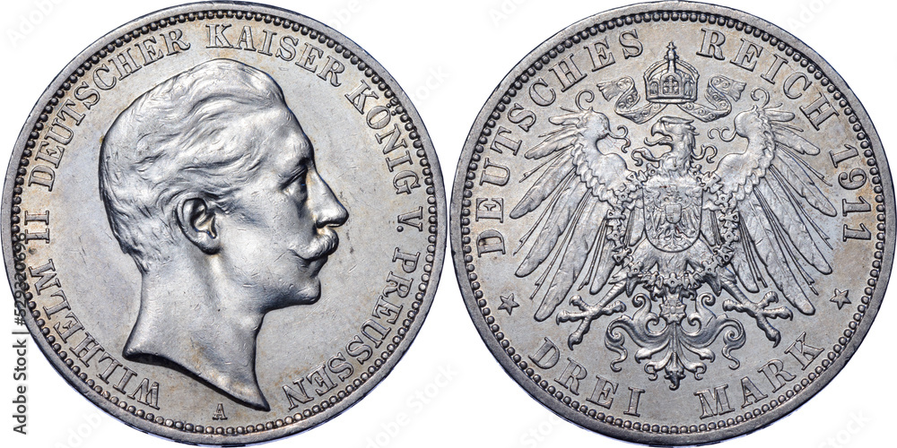 Samolepka GERMANY PRUSSIA, Wilhelm II, 3 Mark 1911, aUNC