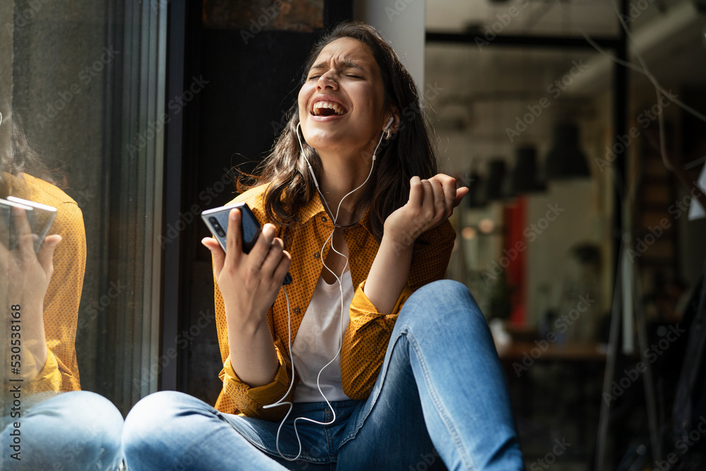 Samolepka Young woman sitting and listening the music