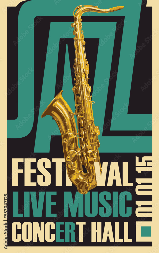 Samolepka Vector poster for jazz music festival and live music concert with golden saxophone and inscriptions
