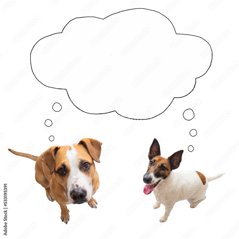 Samolepka Two funny dogs looking at camera with speech bubble, isolated image