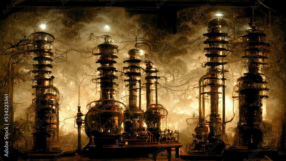 Samolepka Power plant, facility, futuristic llaboratory in cyberpunk style, golden style, mad doctor scientist facility for use in book content, magazine, movies or games, beautiful grunge, steampunk