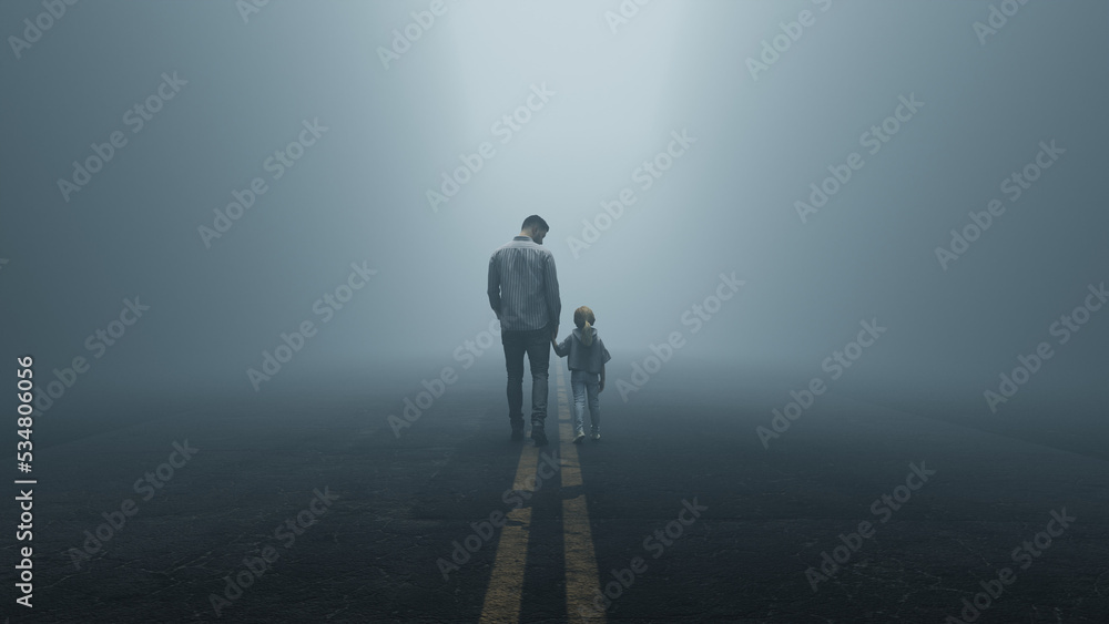 Samolepka A man and little girl holding hands while walking down a foggy road