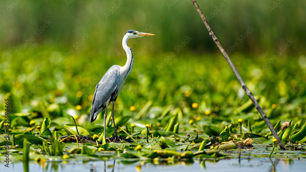 Samolepka A grey heron in the wilderness of the Danube Delta in Romania