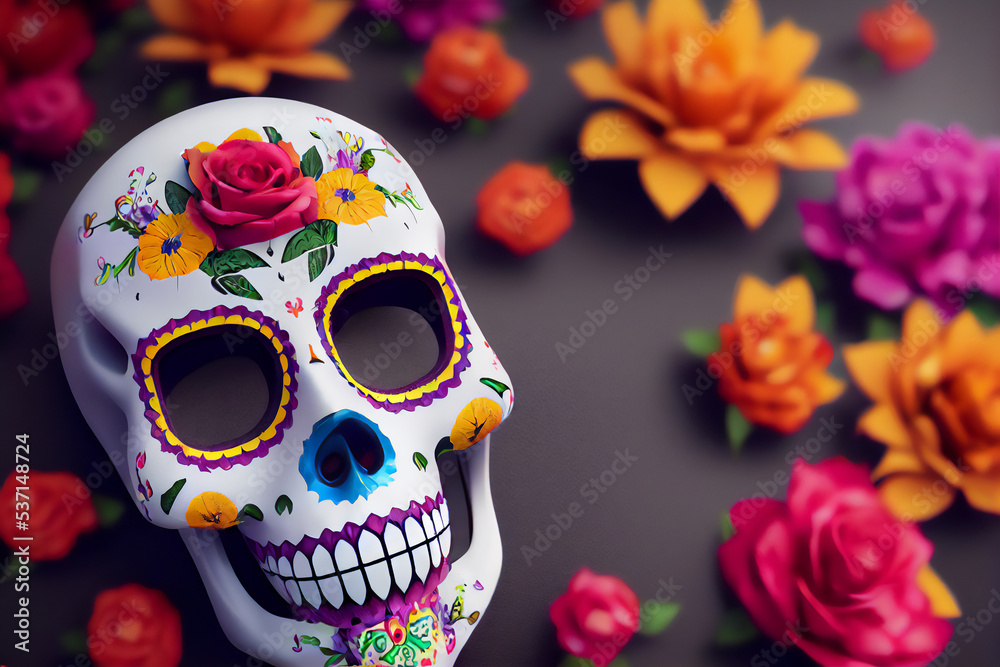 Samolepka Hispanic heritage sugar skull marigold Festive dia de los muertos background 3d