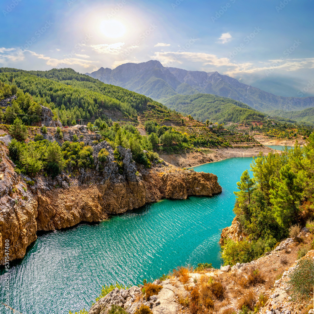 Samolepka Beautiful landscape of mountainous nature with bright summer sun, blue sky, high mountains, green hills, yellow rocks and turquoise water lake