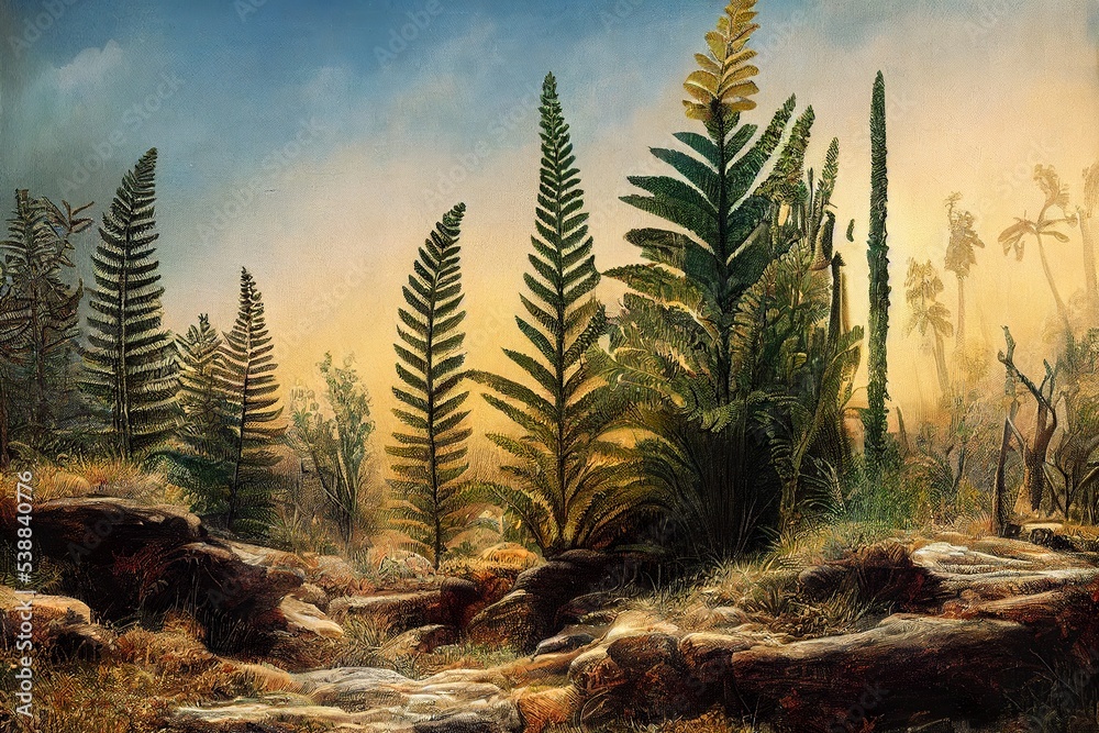 Samolepka Prehistoric landscape of flora and fauna from triassic era