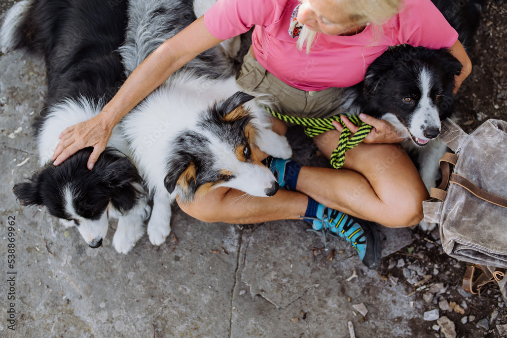 Samolepka Top view of senior woman having break during walking her three dogs in forest