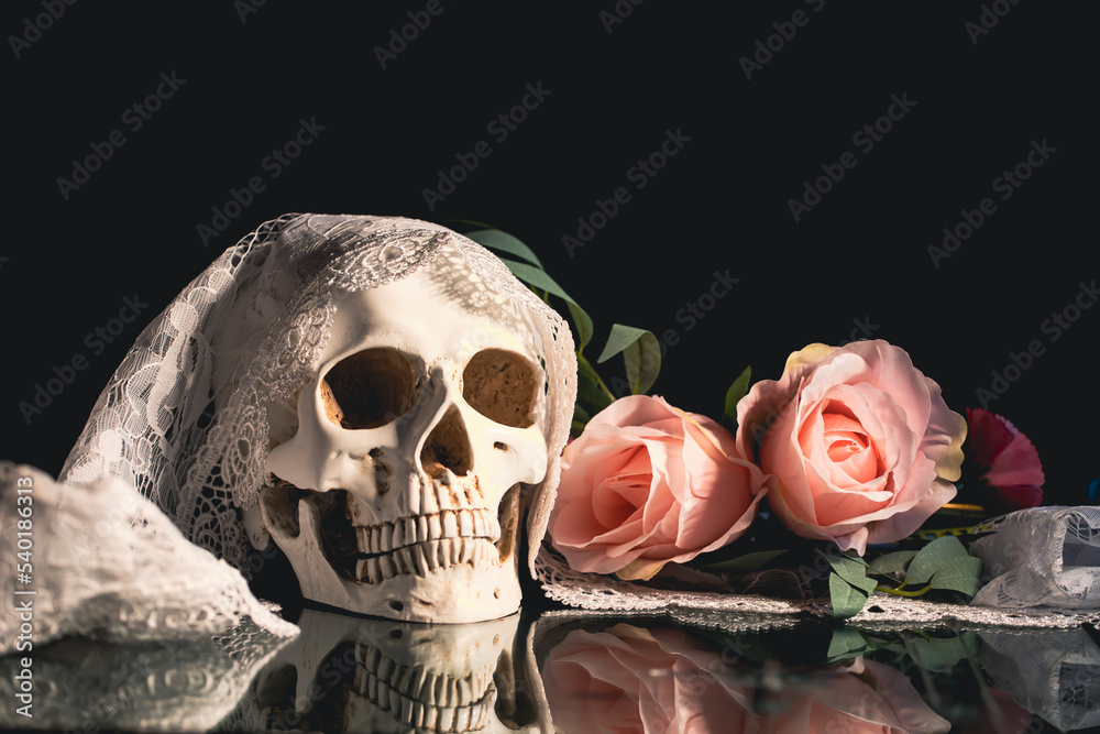 Samolepka Human skull and flowers