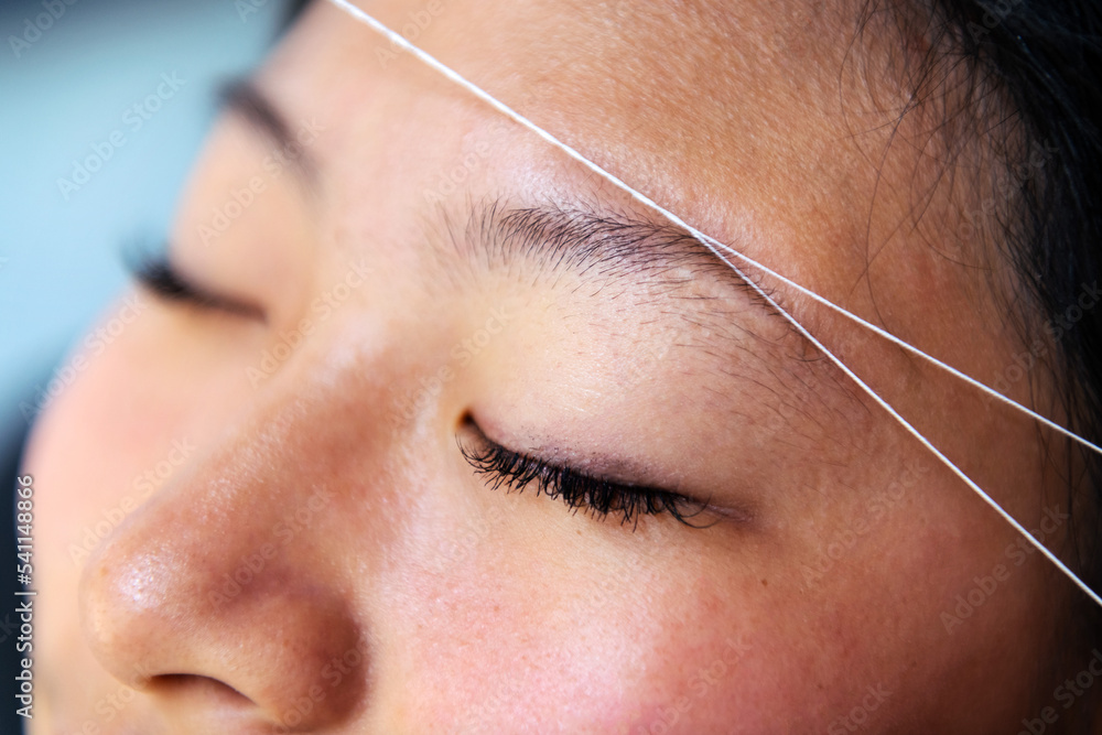 Samolepka detail of an eyebrow waxing with threading on a young woman in a beauty salon, c