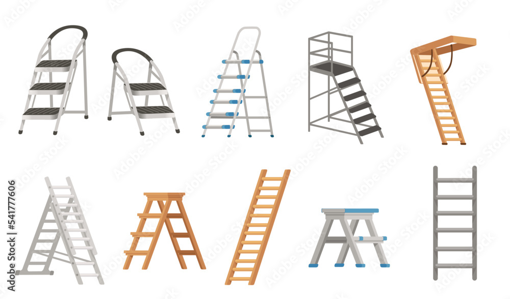 Samolepka Set of steel and wooden folding portable ladder household equipment vector illus