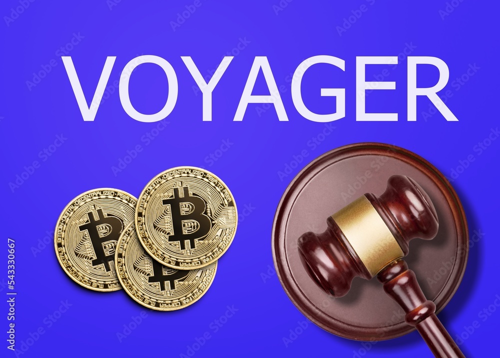 Samolepka Judge's gavel and crypto coins in front and Voyager Digital Ltd company logo