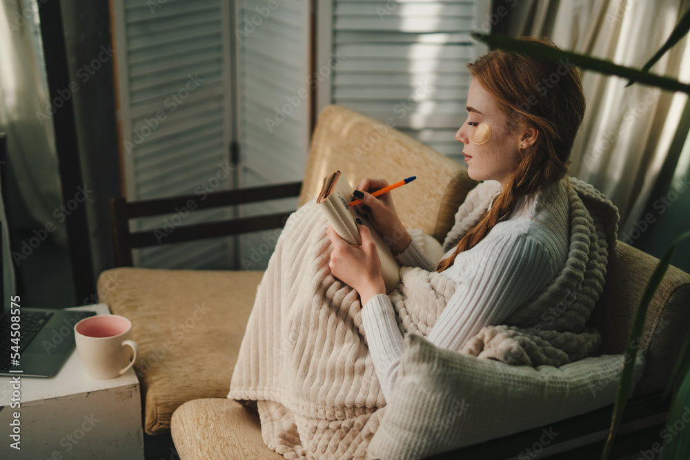 Samolepka Cute lady with eyes patches at home writing notes on a diary while relaxing taking a break, enjoying home lifestyle