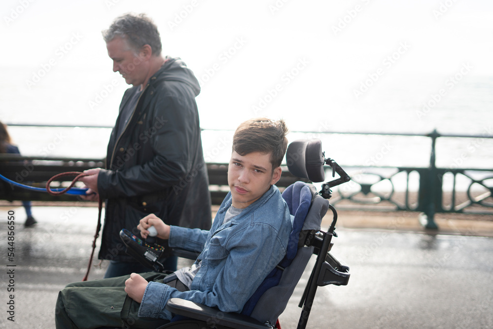 Samolepka Father and disabled son strolling on promenade