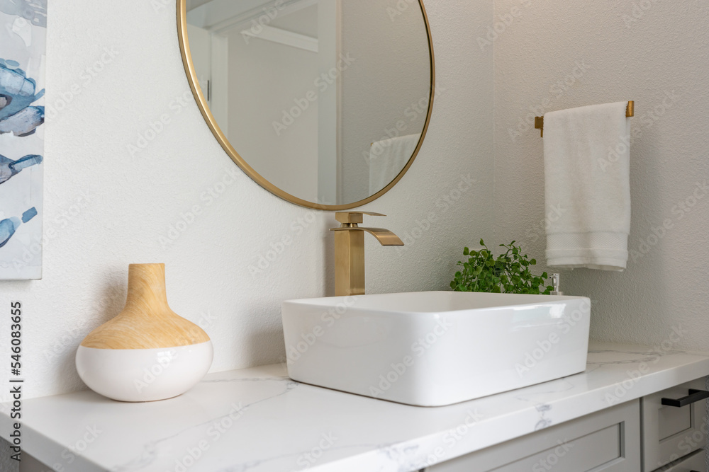 Samolepka Modern bathroom vanity details of gold faucet with raised basin and decorative gold-trimmed mirror