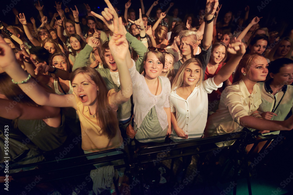 Samolepka Concert, music festival and crowd with rock hands sign for singing, dance and night event, performance and celebration in dark