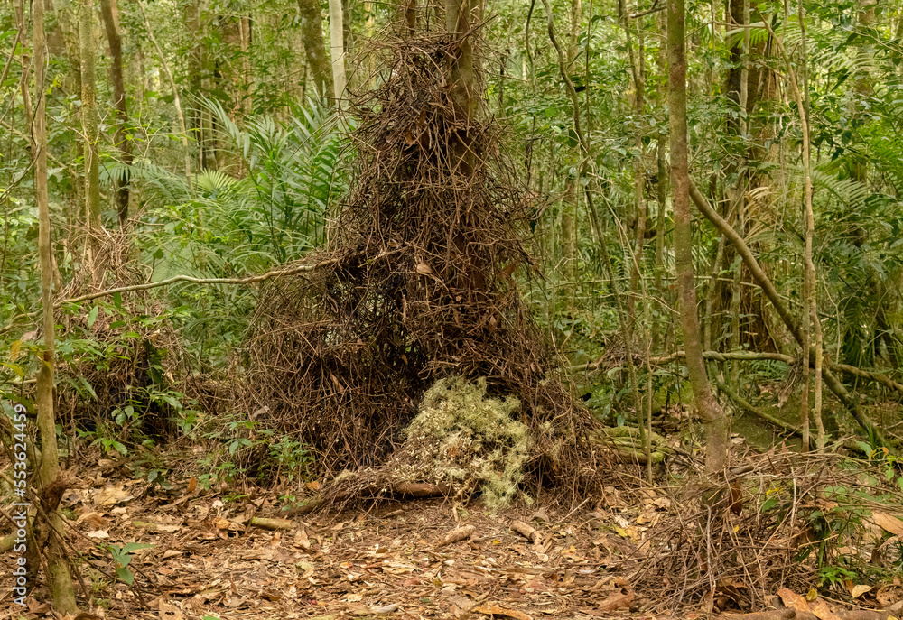 Samolepka Golden bowerbirds bower made of sticks and decorated with lichen, in Queensland, Australia