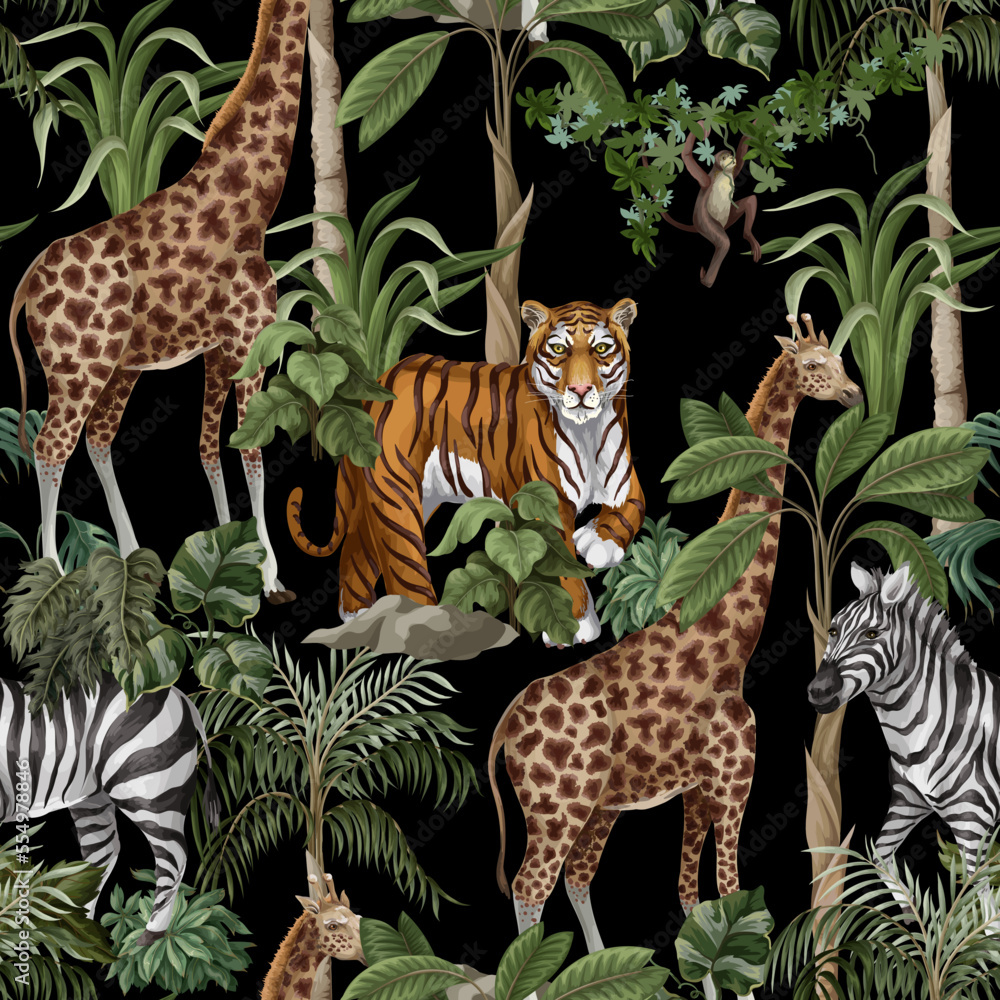 Samolepka Seamless pattern with wild animals and jungle trees for kids